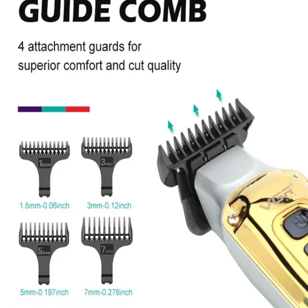 ریشتراش ویجیار مدل 931 همراه با چهار شانه متفاوت عرضه میشود؛ اندازههای این شانهها به کاربر اجازه میدهند طول مو را مطابق نیاز و سلیقه تنظیم کند. این ویژگی برای مدلسازی متنوع یا ترکیب چند استایل، بسیار ارزشمند است. وجود شانههای مختلف باعث کاهش خطر کوتاهشدن ناخواسته یا ناهماهنگی طول در بخشهای مختلف مو میشود. لوازم جانبی ارائهشده شامل برس پاککننده برای زدودن موهای باقیمانده از تیغه و روغن مخصوص برای روانسازی دستگاه است. این ترکیب، نگهداری دستگاه را آسانتر کرده و عمر مفید آن را افزایش میدهد.