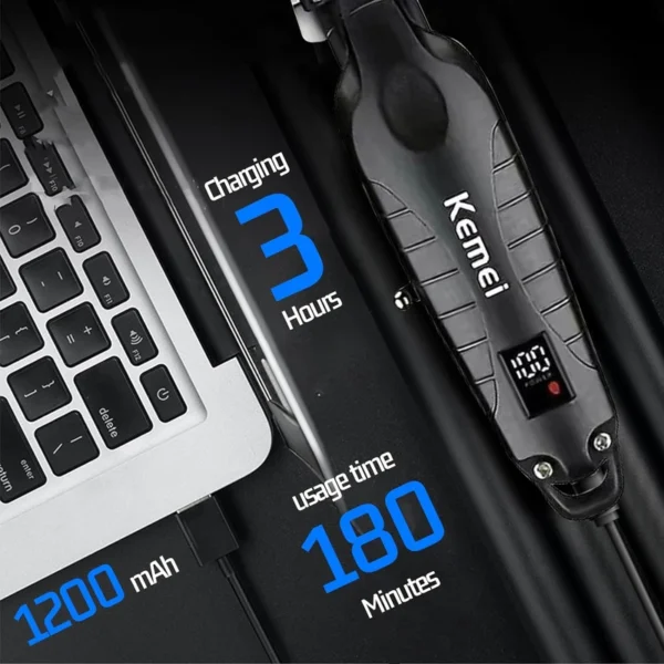 ماشین اصلاح kemei KM‑2293 مجهز به باتری لیتیومی ۱۲۰۰ میلیآمپر ساعتی است که با یکبار شارژ کامل (مدتزمان شارژ: ۱۸۰ دقیقه) تا ۱۸۰ دقیقه استفاده مداوم را فراهم میکند. این میزان شارژدهی برای چندین نوبت اصلاح مو و ریش کافی است و شما را از دغدغه شارژهای مکرر بینیاز میکند. علاوه بر این، پشتیبانی از شارژ با کابل USB به شما امکان میدهد دستگاه را حتی در سفر و با پاوربانک هم شارژ کنید.